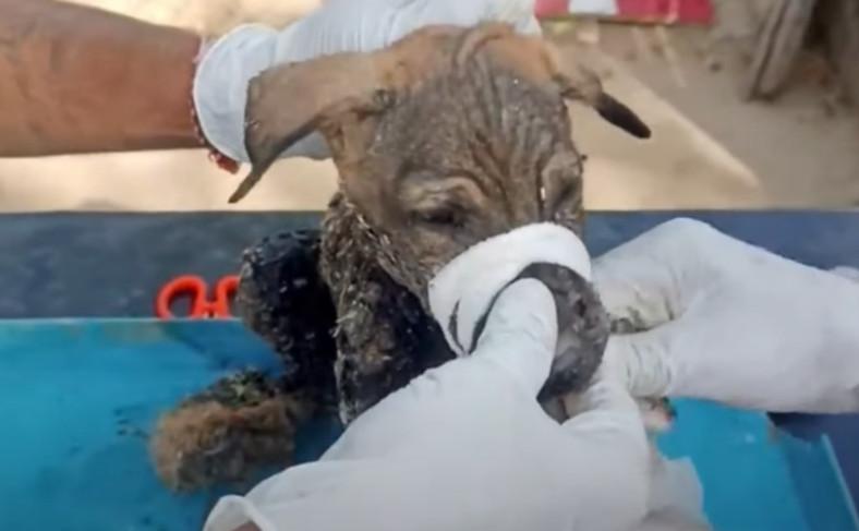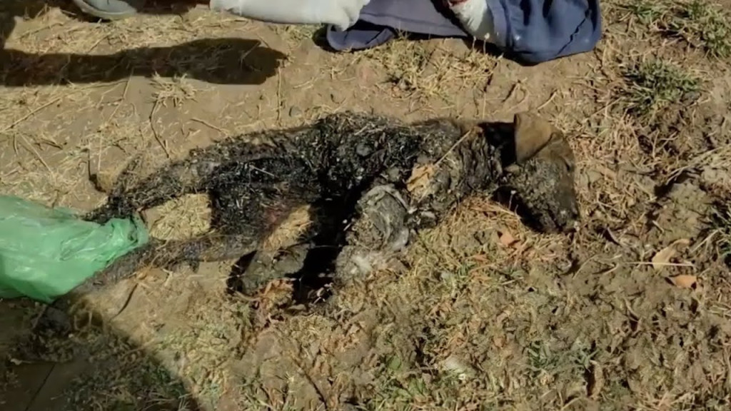 Подойдя ближе, волонтеры обнаружили, что тело животного частично застывшим слоем асфальта приклеено к поверхности — пес попал в вязкое покрытие и оказался фактически прикован к земле. Внешне собака была почти полностью покрыта высохшей смолой, что лишало её возможности передвигаться и сильно ослабляло её состояние.