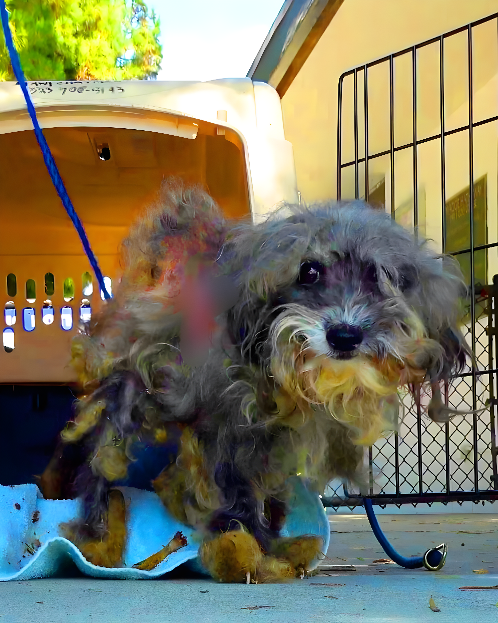 Первое, что увидели спасатели у брошенной собаки по кличке Магги Мэй, потрясло: спутанная и отягощённая колтунами шерсть настолько стянула кожу, что у животного открылись раны, и оно выглядело полностью истощённым и избитым жизнью. Состояние бедняжки было настолько тяжёлым, что даже дикие койоты, обычно не разборчивые в пище, обходили её стороной.