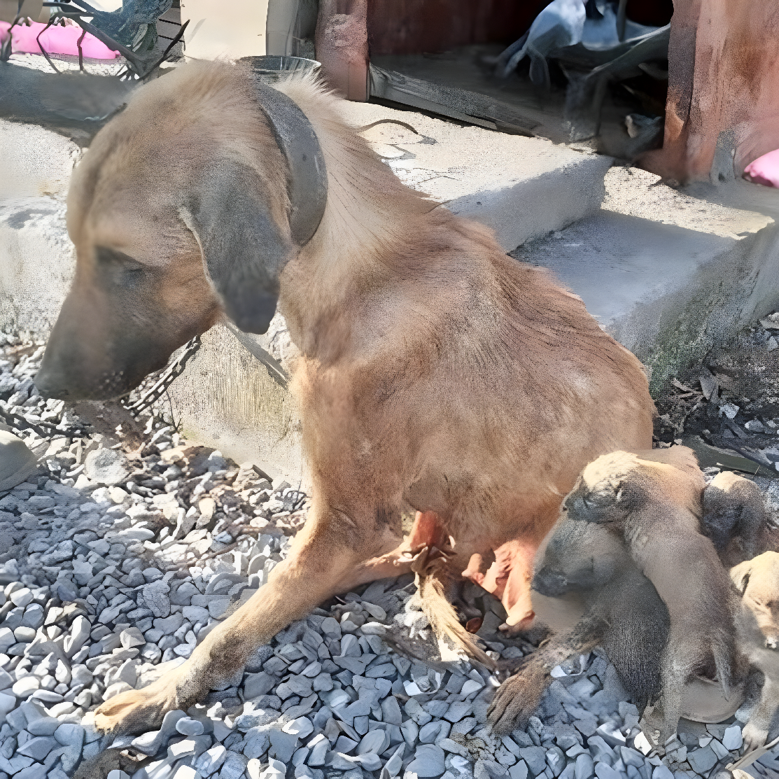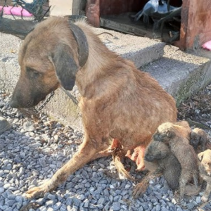 Под палящим солнцем, в забытом дворе, разворачивалась сцена, от которой сжимается сердце: худощавая собака, кожа которой выдавала голод и жажду, была прикована к ржавому столбу. Сил едва хватало стоять, но материнский инстинкт заставлял её наклоняться над крошечными щенками — они прижимались к ней в поисках тепла и молока.