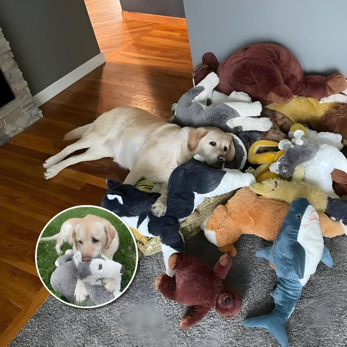 Среди игрушек выделяется гигантский коричневый медведь, который по размеру часто застревает в дверце для собак — это вызывает у семьи улыбку и дополнительные хлопоты.
