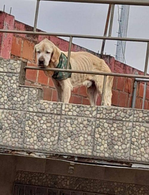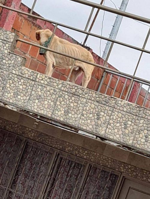 На крыше дома одиноко сидел истощённый пес — его углублённые глаза и трясущиеся лапы говорили о длительной боли и заброшенности. Казалось, что каждое движение выдаёт годы лишений, а тело почти не скрывало кости под кожей.