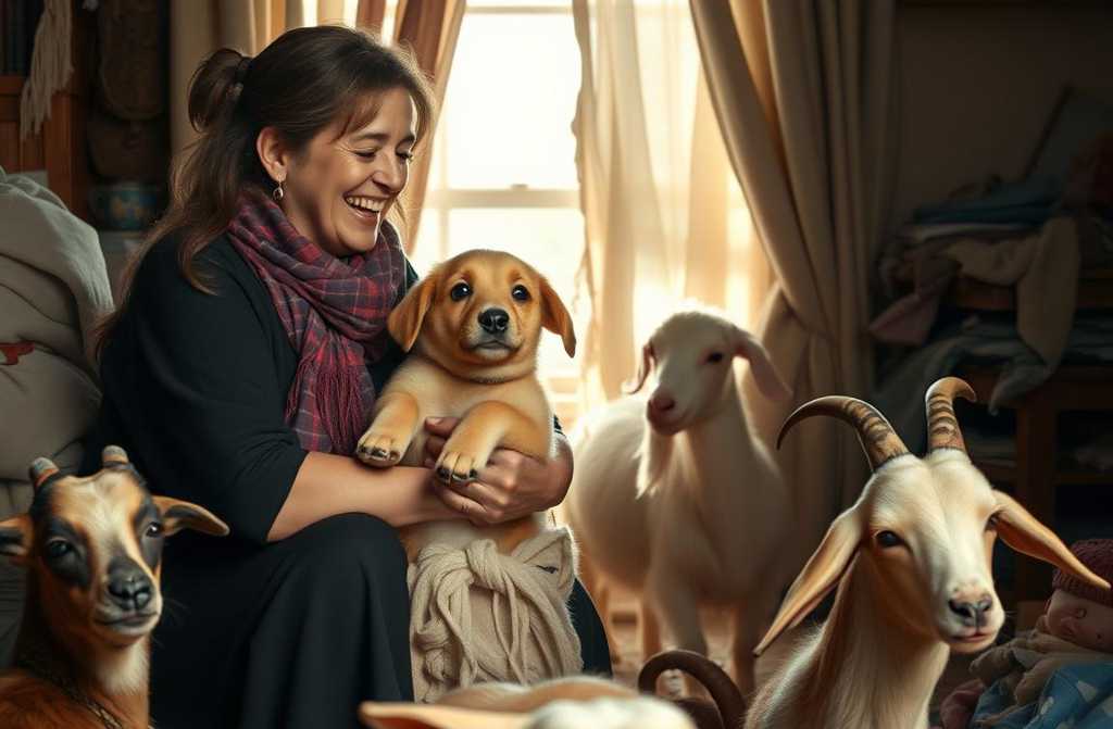 Оказалось, они с мужем взялись передерживать спасённых животных «всего на пару недель». Но недели превратились в двенадцать зверей: две козы, четыре котёнка, три щенка и парочка проказливых кроликов, которые, видимо, обожают шторы на вкус.