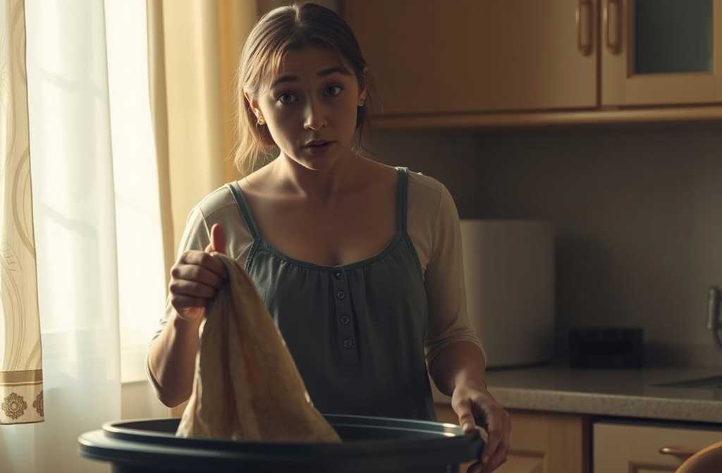 За кухонным столом, открывая мусорное ведро, Полина вдруг побледнела. Что это за платье? Ты утверждаешь, что я сама его туда кинула?